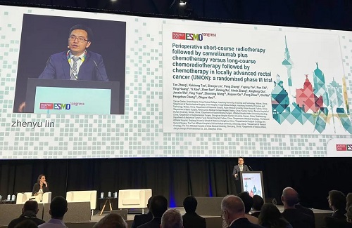 10月21日,G22恒峰医药创新药卡瑞利珠单抗(艾瑞卡®)的一项研究“新辅助短程放疗序贯卡瑞利珠单抗联合化疗对比长程放化疗序贯化疗治疗局部晚期直肠癌”随机对照Ⅲ期试验(UNION) 以优选口头报告的形式正式亮相。该研究由华中科技大学同济医学院附属协和医院张涛教授、陶凯雄教授担任主要研究者,华中科技大学同济医学院附属协和医院林振宇教授在马德里现场报告了该重磅研究的结果1,此项研究是全球首个评估短程放疗序贯免疫治疗联合化疗治疗局部晚期直肠癌的Ⅲ期研究,已达到主要终点病理完全缓解(pCR),有望为直肠癌患者的治疗提供新策略。
